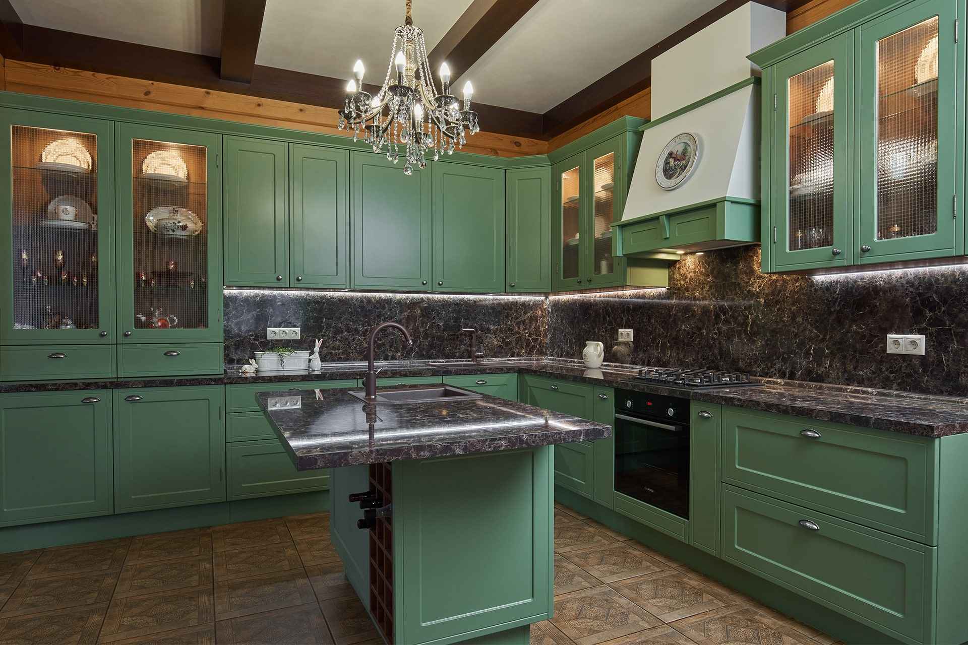 Хорошая новость: гарнитуры в зеленом и изумрудном исполнении универсальны, их можно использовать для любого стиля. Главное – правильный выбор оттенка и текстуры фасадов мебели.