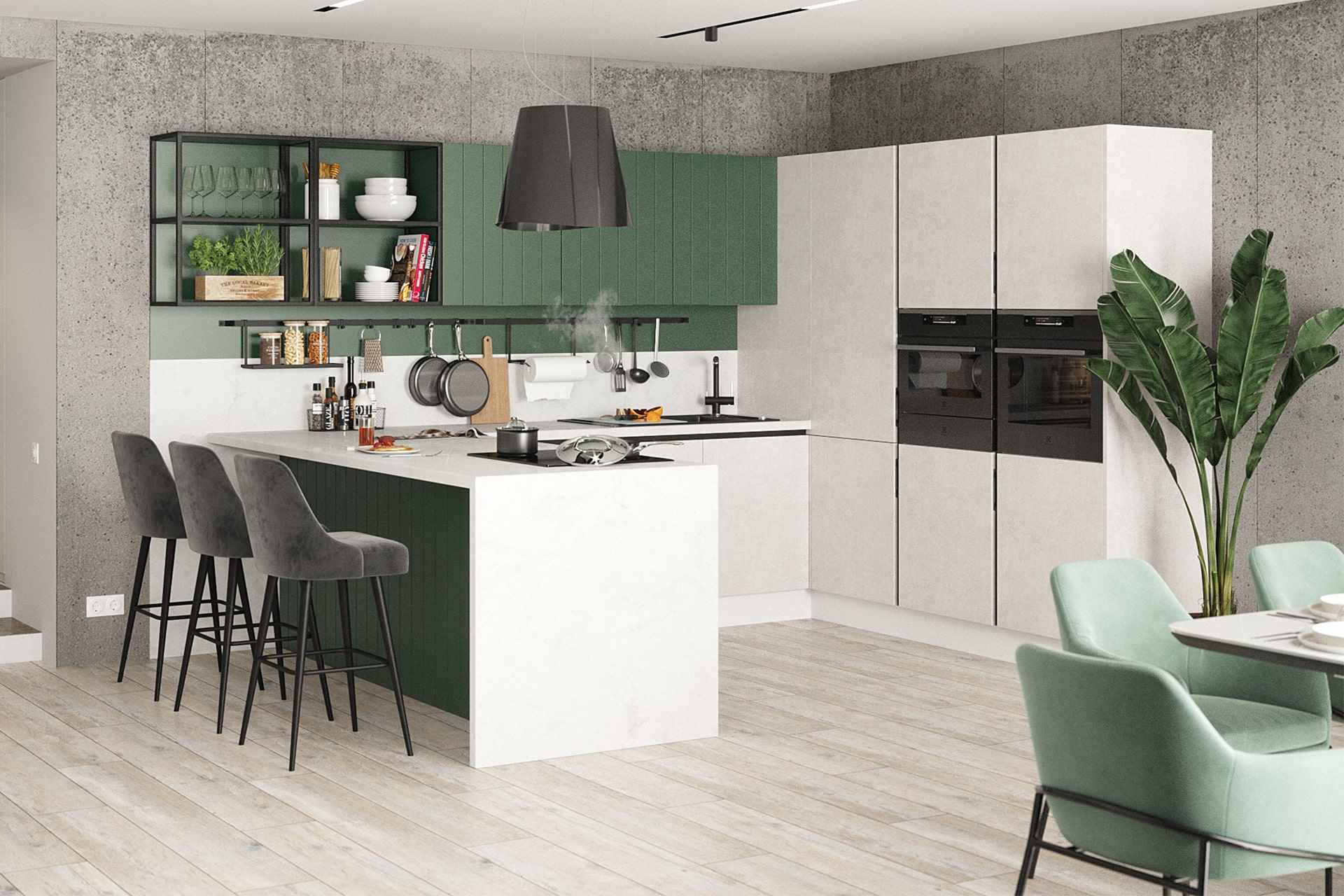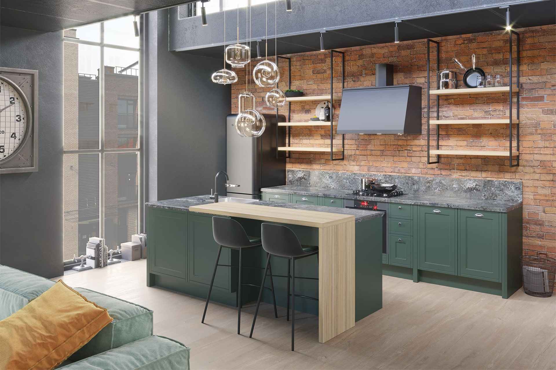 Глубокий зеленый цвет смягчает этот брутальный стиль. Для отделки фасадов можно использовать пластик – однотонный или с текстурой под окрашенный массив. Вместо шкафов под потолок часто устанавливают открытые полки. Если кухня объединена с гостиной или прихожей, интерьер делают общим, с единым оформлением.